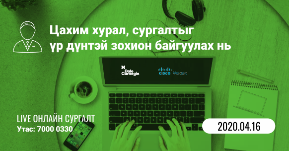 Дэлхий нийтэд үүсээд буй нөхцөл байдлаас болоод ихэнх байгууллага болон хувь хүмүүс гэрээсээ ажиллах нь ихэссэн байна. Мэдээж энэ үед ажлаа зогсоохгүй байх үр дүнтэй арга хэдийч зарим талаарай сул тал мөн байж болох юм. Та онлайнаар илүү үр дүнтэй ажиллахад, уулзалтуудаа онлайнаар хийх, сургалтаа зохион байгуулах, багийн гишүүдээ онлайнаар удирдаж ажиллах гээд олон бэрхшээлүүдтэй нүүр тулж байгаа байх. Тэгвэл Дэйл Карнегийн энэхүү хөтөлбөрт онлайнаар үйл ажиллагаагаа илүү үр дүнтэй болгох арга шийдлээс суралцаарай.